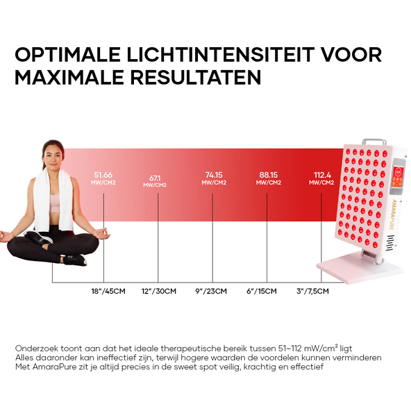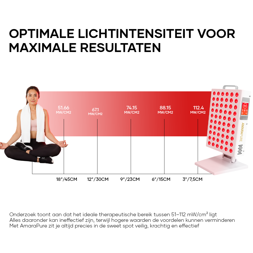 - Afstand & duur: 5–10 minuten per zone als start; bouw op naar 10–20 minuten per gebied. Houd 15–45 cm afstand volgens de handleiding. Start met 3–5 sessies per week.