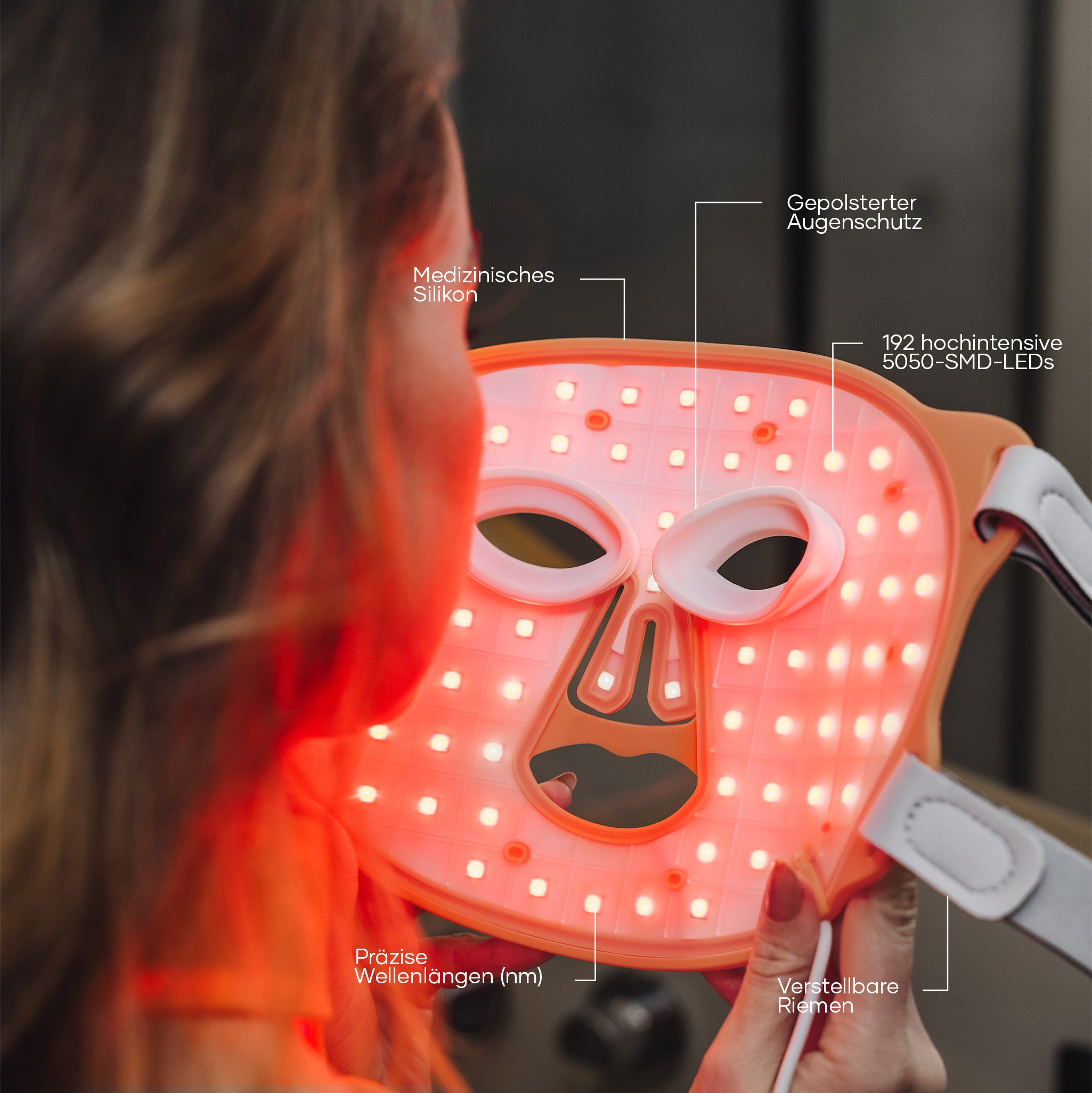 Die Rotlichtmaske stimuliert die Kollagenproduktion und verbessert die Hautstruktur. Ihre Haut fühlt sich straffer, glatter und sichtbar frischer an – jeden Tag aufs Neue.