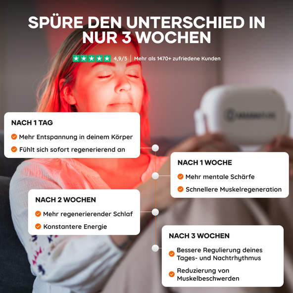 • Mehr Energie & besserer Schlaf Bei regelmäßigen Sitzungen können bereits kurze tägliche Behandlungen einen Unterschied machen.