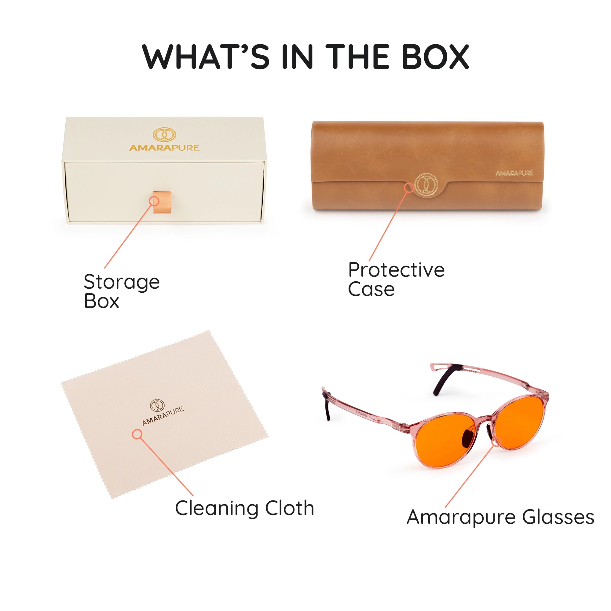 Discover the unique properties of our AmaraPure Blue Light Glasses. Hover over the hotspots to learn more about the design, protection and comfort these glasses provide.