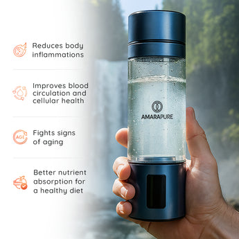 AmaraPure™ enriches your water with up to nine times more therapeutic hydrogen through the hydrogen water bottle, turning regular hydration into a powerful ally against oxidative stress and free radical damage. Just one to three bottles a day can give your body a boost, leaving you energized, ultra-hydrated, and ready for anything.