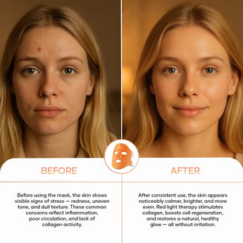 The red light mask stimulates collagen production and improves skin texture. Your skin feels firmer, smoother, and visibly fresher — every day anew.