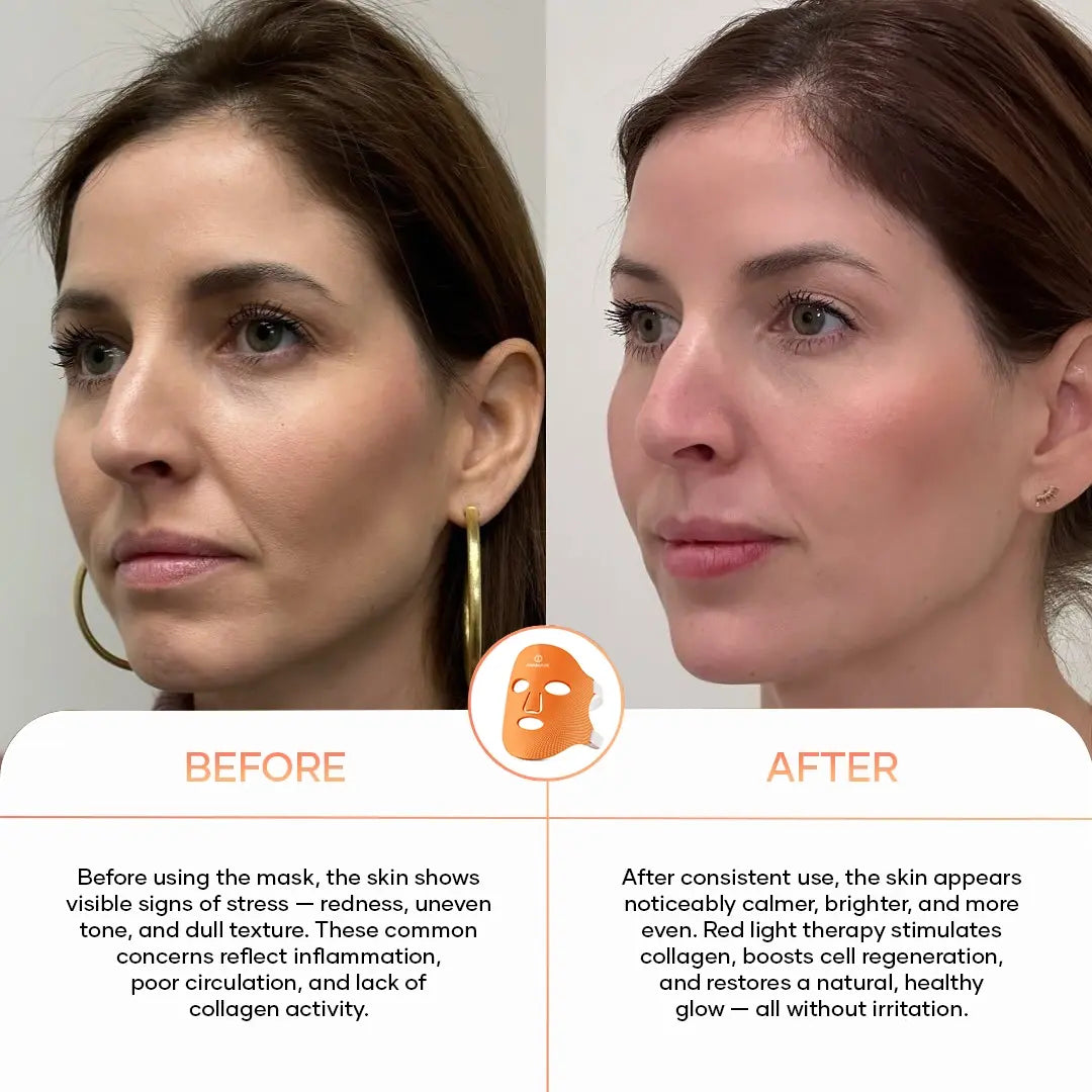 Rødlysmasken stimulerer kollagenproduksjonen og forbedrer hudstrukturen. Huden føles fastere, glattere og synlig friskere — hver dag på nytt.